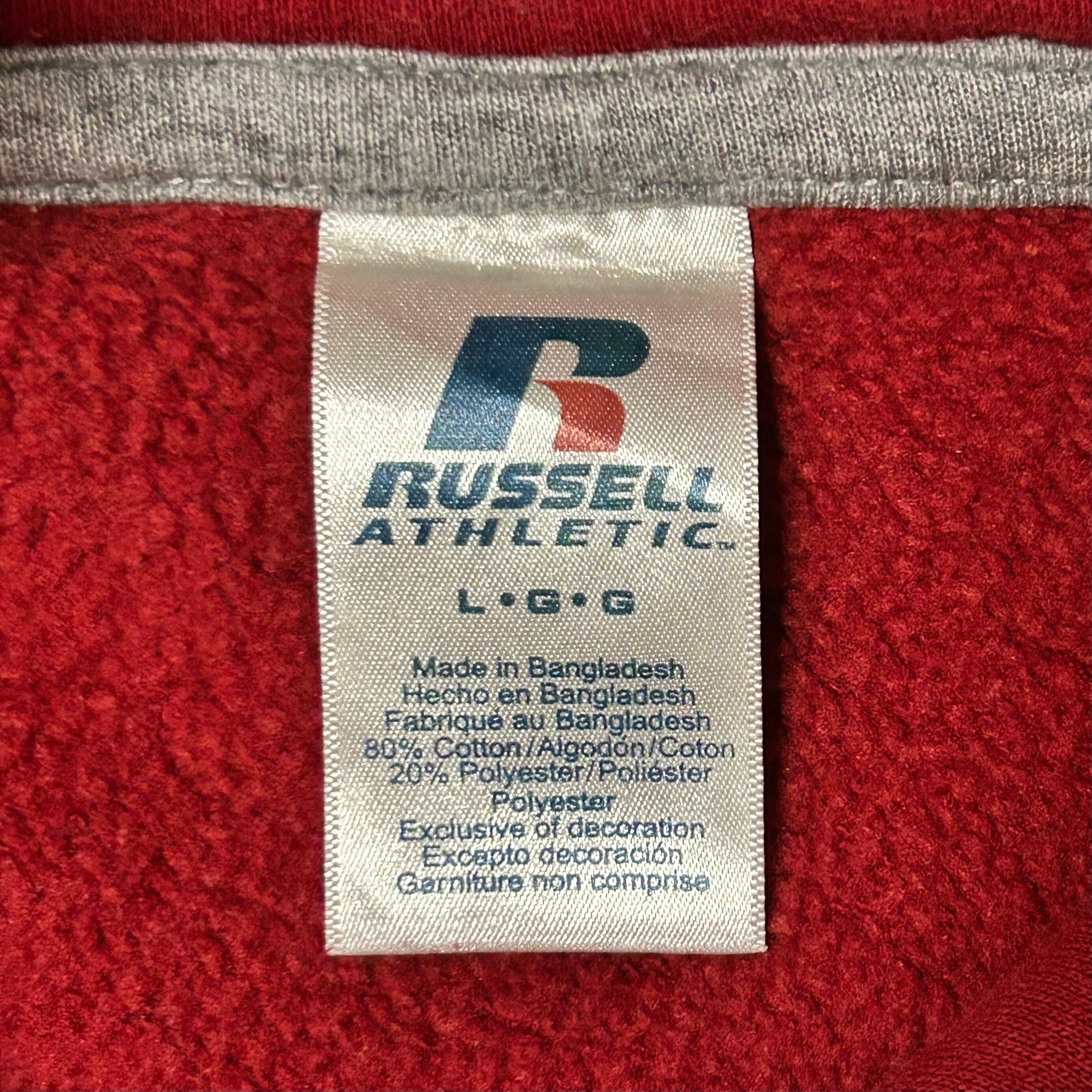 アメリカの老舗スポーツウェアブランド、Russell Athleticによるシンプルな赤の無地パーカー。